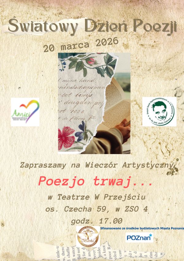 Obchody Światowego Dnia Poezji zaczynamy w poniedziałek 16 marca wystawą poetycką w Teatrze W Przejściu. Od środy można wieszać na kotarach swoje wiersze opatrzone pseudonimem, którego nikomu nie ogłaszamy. W piątek do godziny 12.00 każdy może zagłosować na wybrany przez siebie wiersz Uczniów opatrzony numerem przez organizatorów. Głosy wrzucamy do urny na stoliku w Teatrze. Ogłoszenie wyników odbędzie się 20 marca podczas Wieczoru Artystycznego, który odbędzie się w godz. 17.00-19.00. Podczas Wieczoru wystąpią znani poznańscy poeci, z którymi będzie można porozmawiać. Zwycięzcy otrzymają dyplom i upominek. Zapraszamy do czytania wierszy i ujawnienia swoich.